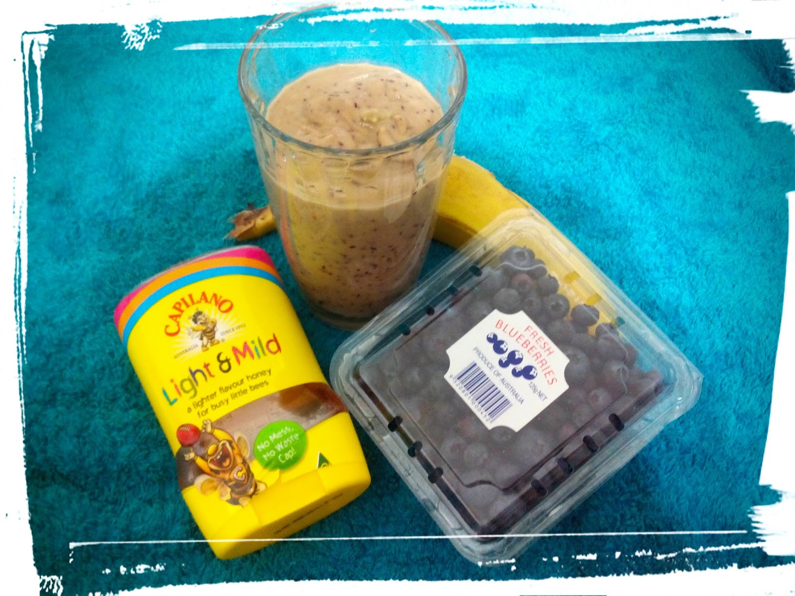 One Peach, one Kiwi and a handful of Blueberries. You can add honey if you find the smoothie too sour.