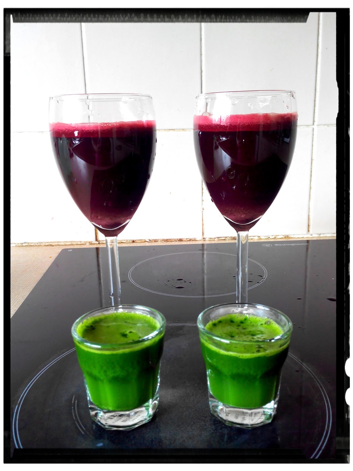 This is how I started my Sunday morning. With shots of plain Kale and a drink of Beetroot.