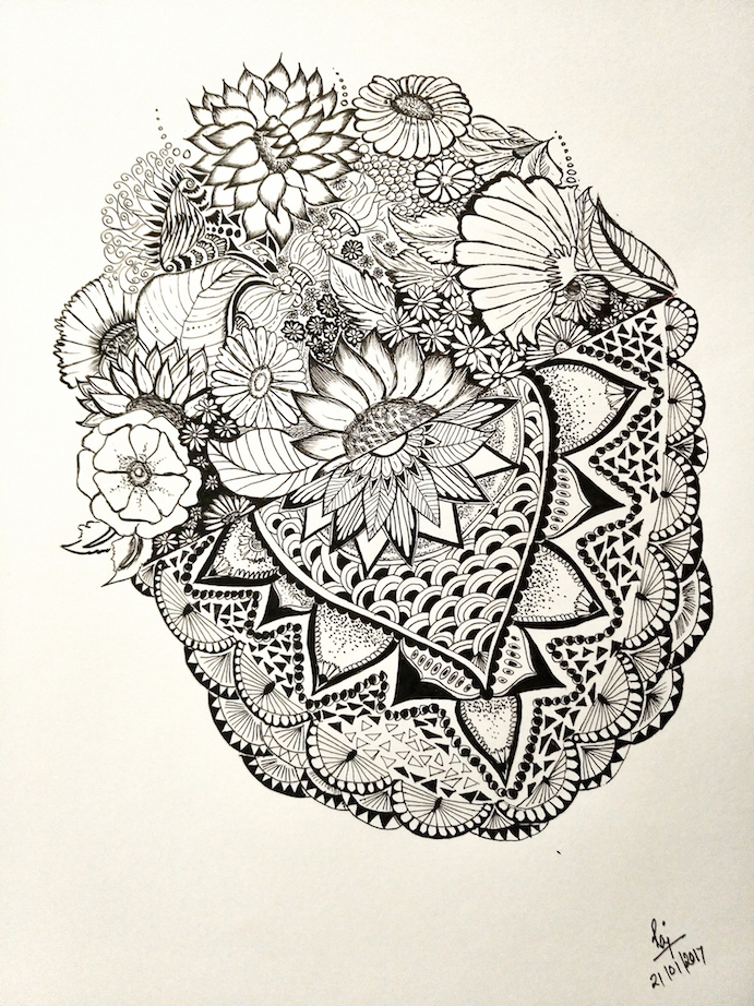 There are certain zentangle patterns (you can find the tutorial online) which you can use but overall it's all up to you, like drawing a Mehendi. You can repeat the same design or add in new ones. I looked up Pinterest for zentangle ideas and then just started drawing whatever that came to my mind. Please feel free to DM me if you need any help 🙂 Thank you so much for your wonderful comment 😀