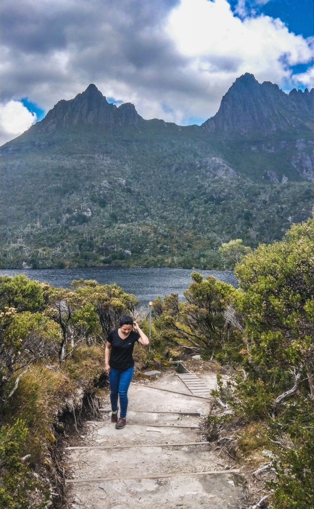 After about 15 minutes of the bus ride, we alighted at Dove Lake. The weather was absolutely perfect, a bit cloudy and not too cold. This was probably the first time during our road trip when the sun wasn’t blazing on our faces.